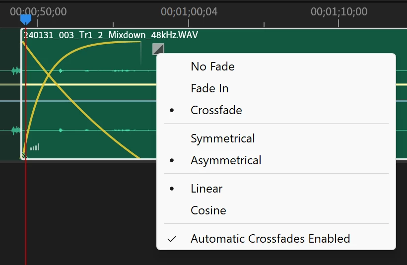 Can we get the Fade Shapes Cosine and Linear into the context-click menu when right-clicking on a crossfade? Having to switch it up in the effects controls isn't as streamlined as it could be. Some sort of hotkey (ALT or CTRL & click) to be able to instantly swap would be huge. Fading in and out to silence generally sounds better when it's more linear than cosine to my ears, so being able to switch with a modified click would be a benefit.