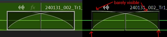 The actual lines that represent the clip amplitude in a fade are overdrawn, and are hidden under a large border. There's a big transparent white border around fades with a black inset, which overlaps and obscures my view of the fade lines. Can these be fade lines be shrunk down and drawn only within the inside the visible region, not overlapped by the border? It would make things much easier to see.