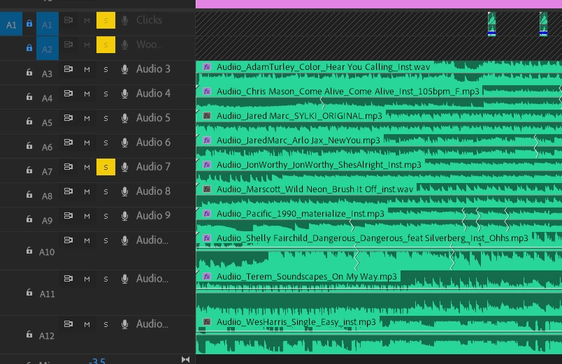 I am auditioning about 10 music tracks for my edit at the moment, and soloing each one as I want to listen to it. It's not immediately obvious which tracks are muted/soloed and which are not, other than by looking at the M and S indicators. It'd be nice if the muted tracks (whether muted because I've set them to Mute or if I've set other track(s) to Solo) appeared dimmer than the 'live' tracks.