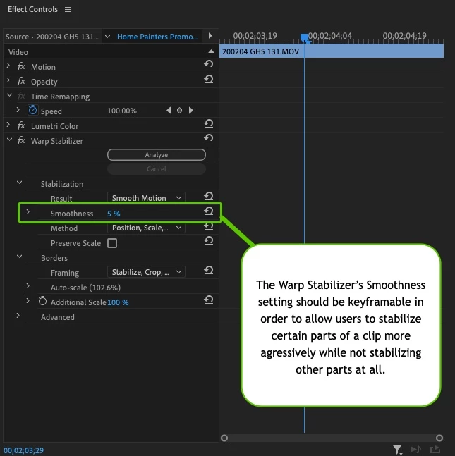 Smoothness keyframes would make it possible to stabilize just certain parts of a shot, smoothly transitioning out of Warp Stabilizer at parts of a shot that don't need stabilization, or that cause stabilizing issues because of a fast moving subject in the foreground, for example.