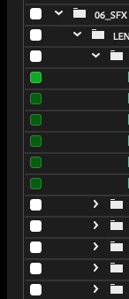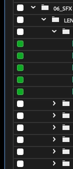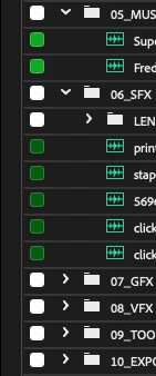 I define SFX and MUSIC under two different green layers, to help differentiate my music, stems, sound effects, etc., in the timeline and keep it organized.