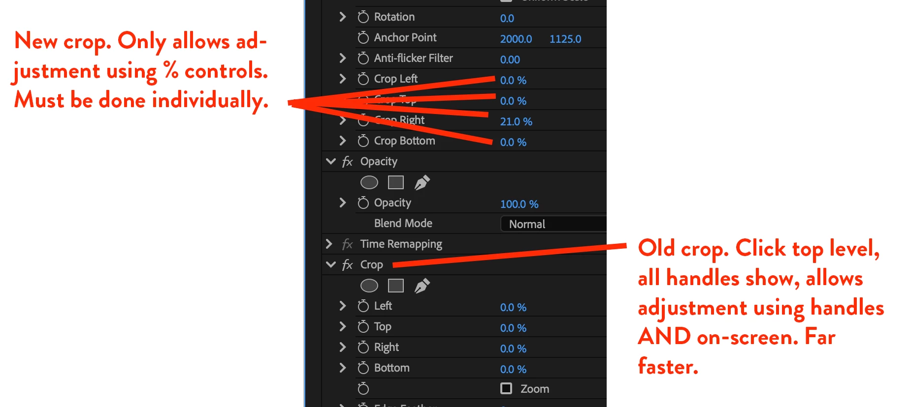 Recently you added (new) CROP controls for any item on the timeline (into the effects controls panel. Generally, a good addition!