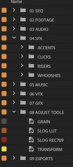 At this time, in my current workflow I have a folder system and inside each Bin I create my file structure; FOOTAGE, SFX, MUSIC, AUDIO, GFX, VFX, TOOLS, etc...