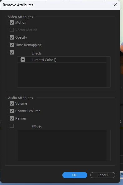It already bothered me a bit, but not enough to complain about it. But at the moment I am working for an e-learning programme which has a lot of sequences and clips. Because I made a color correcting mistake I need to remove the Lumetri attributes of a lot of clips in a lot of sequences and replace it with an adjusted one. For every clip I first need to deselect all attributes every time until only Lumetri is selected. This way it takes a lot of time (and patience) to change everything.