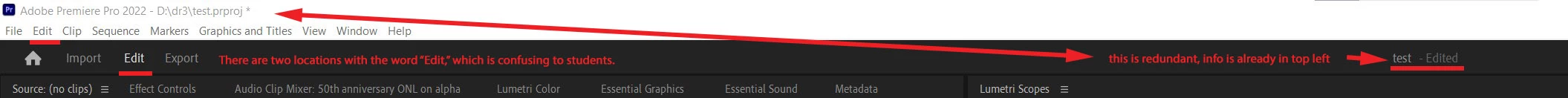 The bar serves no actual purpose, and I would argue it will actually confuse my students (I teach After Effects and Premiere). See the attachment with notes. You've got the word "Edit" now existing in two separate locations.