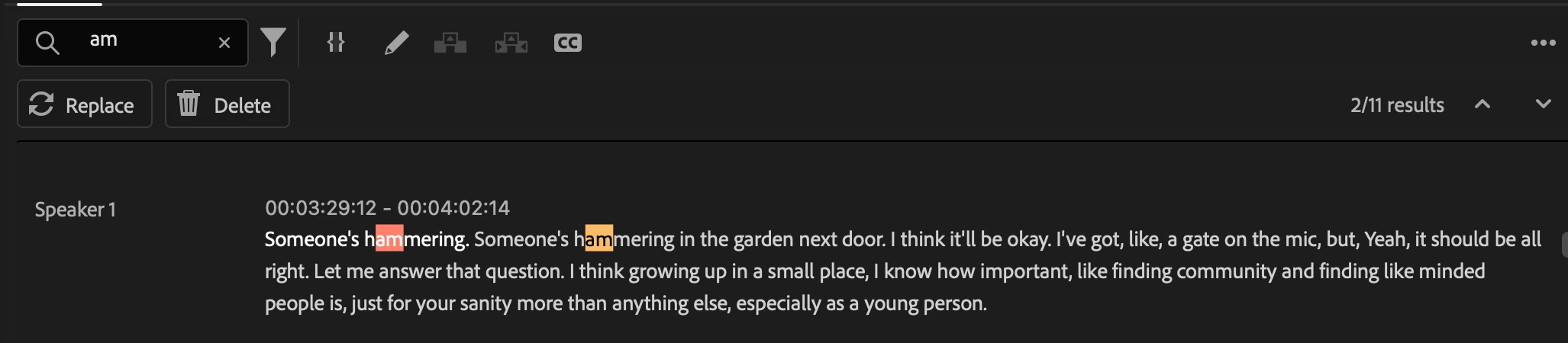 Sometimes I like to select a word from an interview to change the intonation of a sentence, let's say 'am' as an example. If you have everything in a rushes timeline, whenever you cut the word out (let's say you eat into the word like 'camera'), the text feature automatically jumps in the timeline before you can copy and paste the clip you just cut out and you can no longer search for that word as premiere doesn't recognise it anymore as you've cut into it.