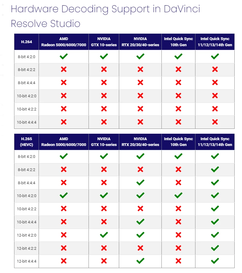 Came accross some info about Intel CPUs and their decoding capabilities and was surprised to find out Davinchi Resolve has so many more formats to decode with the iGPU. I thought there was some limitation in the CPU itself that it cannot decode certain formats but as it appears it's the software and there are no limitations except the software developer's desire.