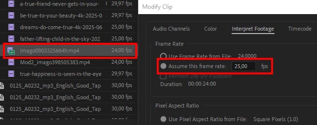 As Premiere's internal frame rate interpolation often degrades the quality of the footage, we like to change the playback frame rate to 25 fps in cases like this: