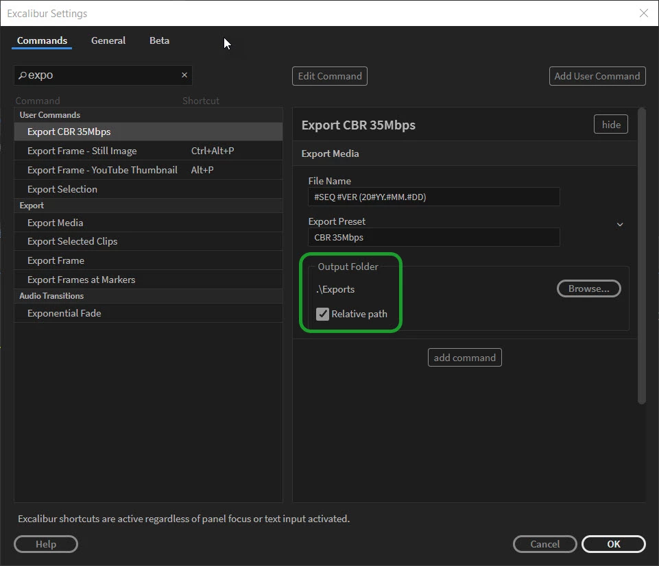 This workflow would address the needs of all editors: those who want exports saved in locations relative to each individual project, as well as those who want exports from all projects to appear in the same place!