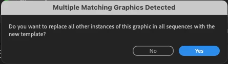 We really like the "ALT + Drag" function to replace mogrt graphics for different aspect ratios and different layouts without filling in the text one more time. Currently there are two options available if you want to replace graphics from the same instances. You can replace the one you choose or replace all instances of the template in the whole project.