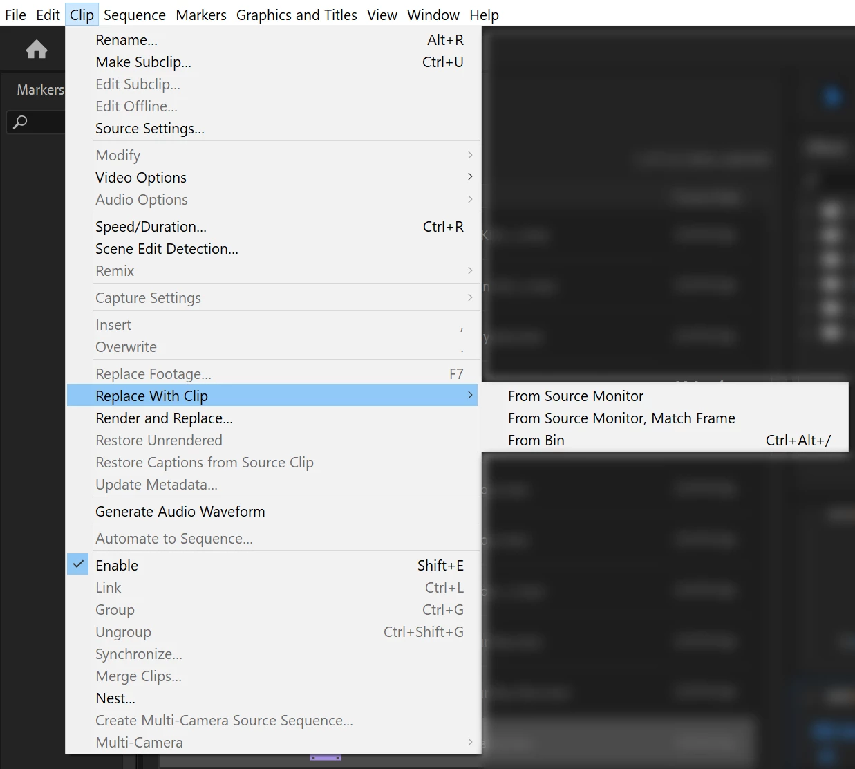 Request: Clip > Replace With Clip > from Bin, Match Frame