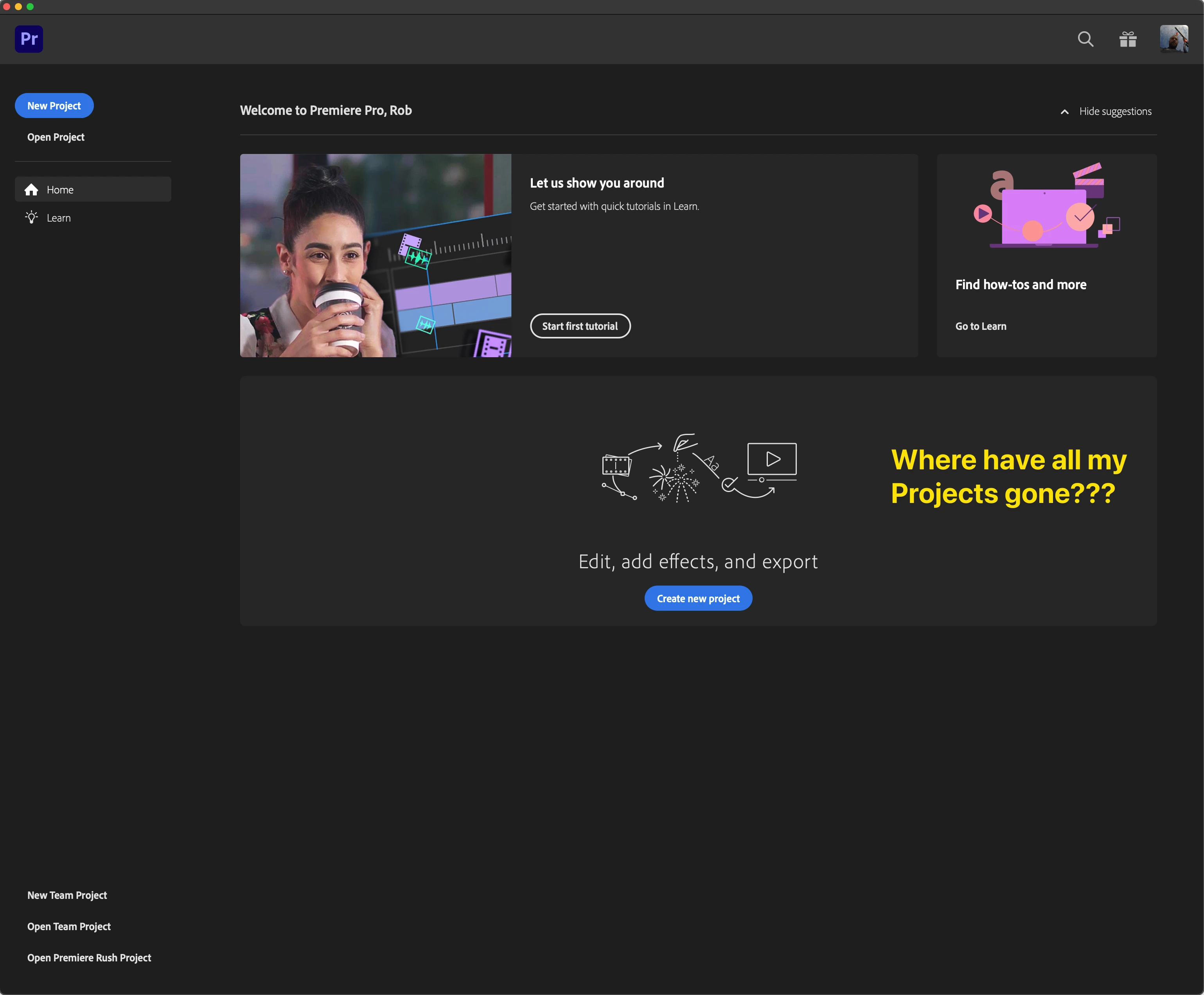 Currently if you have projects on external drives and you launch PP then any of those projects will be removed from the list of Recent Projects that are shown on the Home screen: