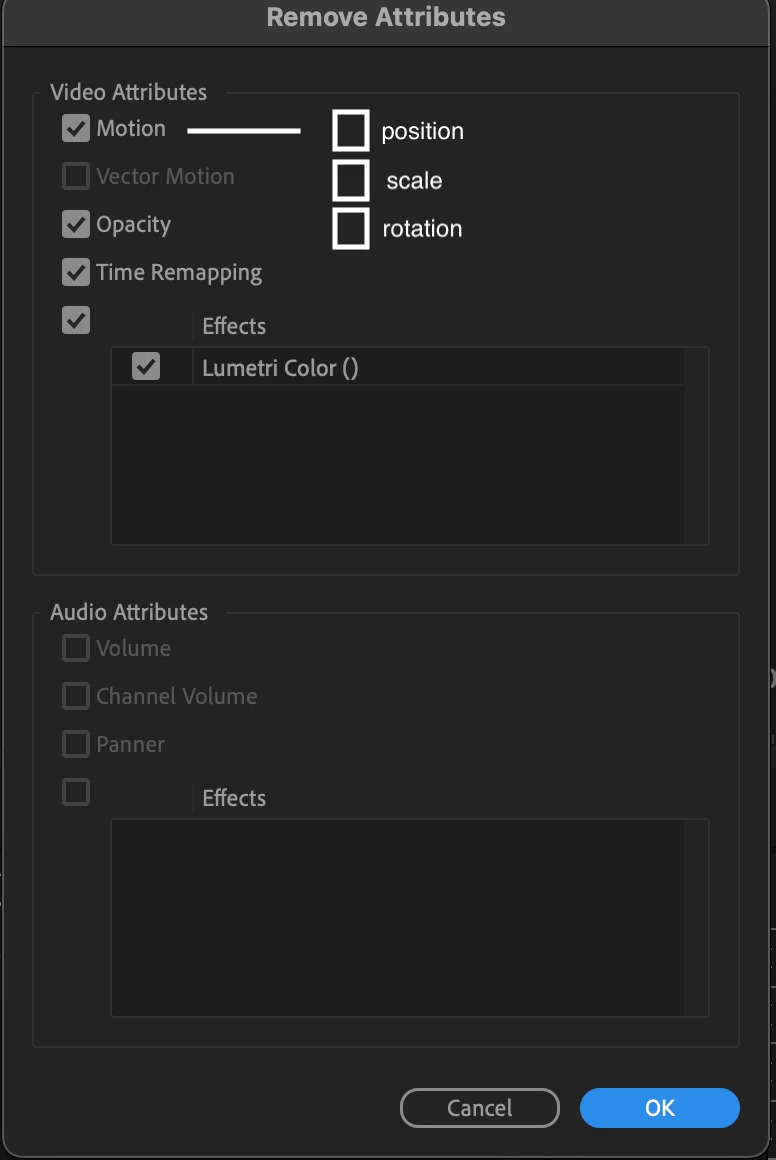 So often when working across formats it would be useful to have this feature - to remove just one element of Video Attributes from a clip / or many clips - such as scale, position, or rotation.