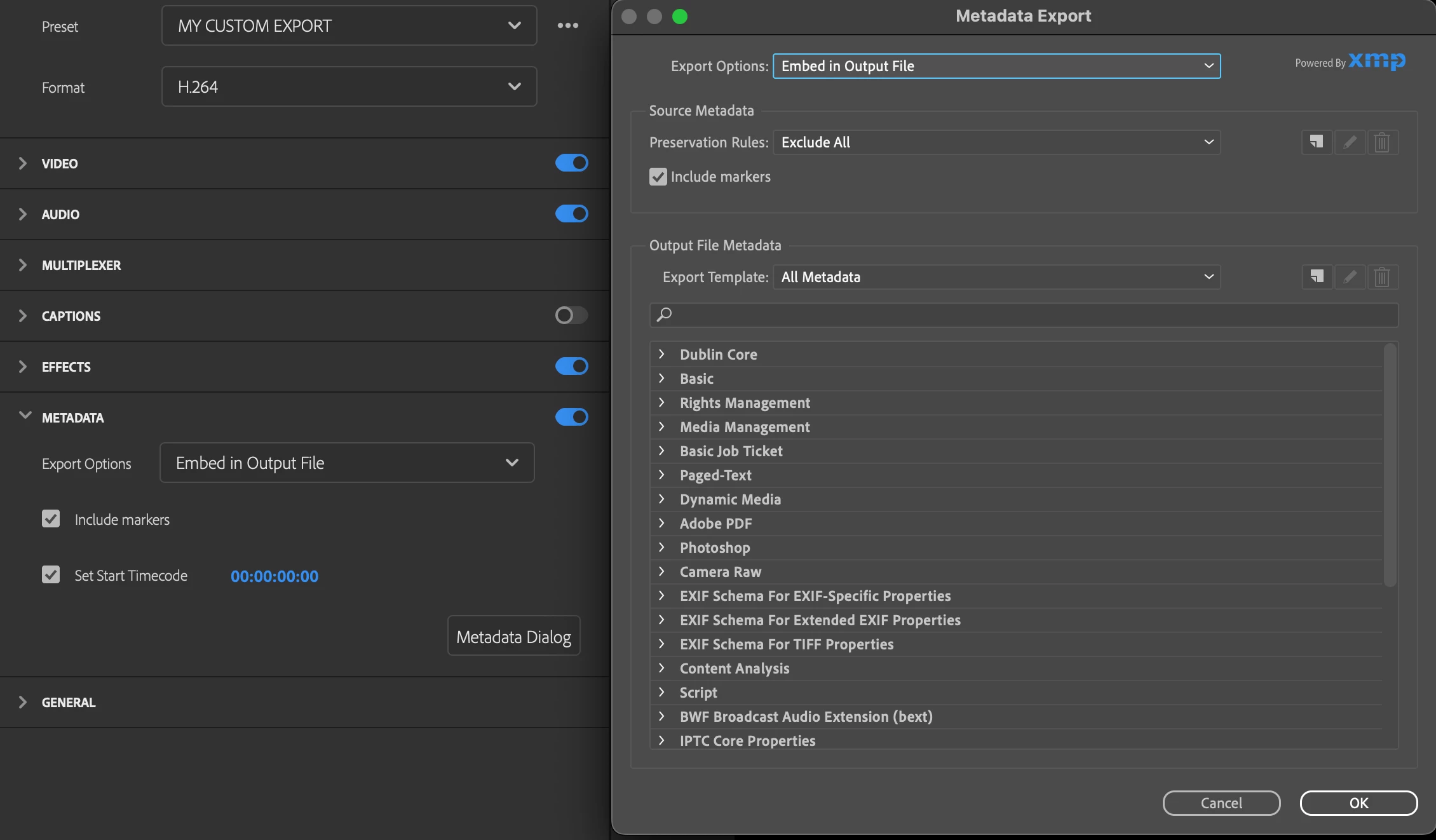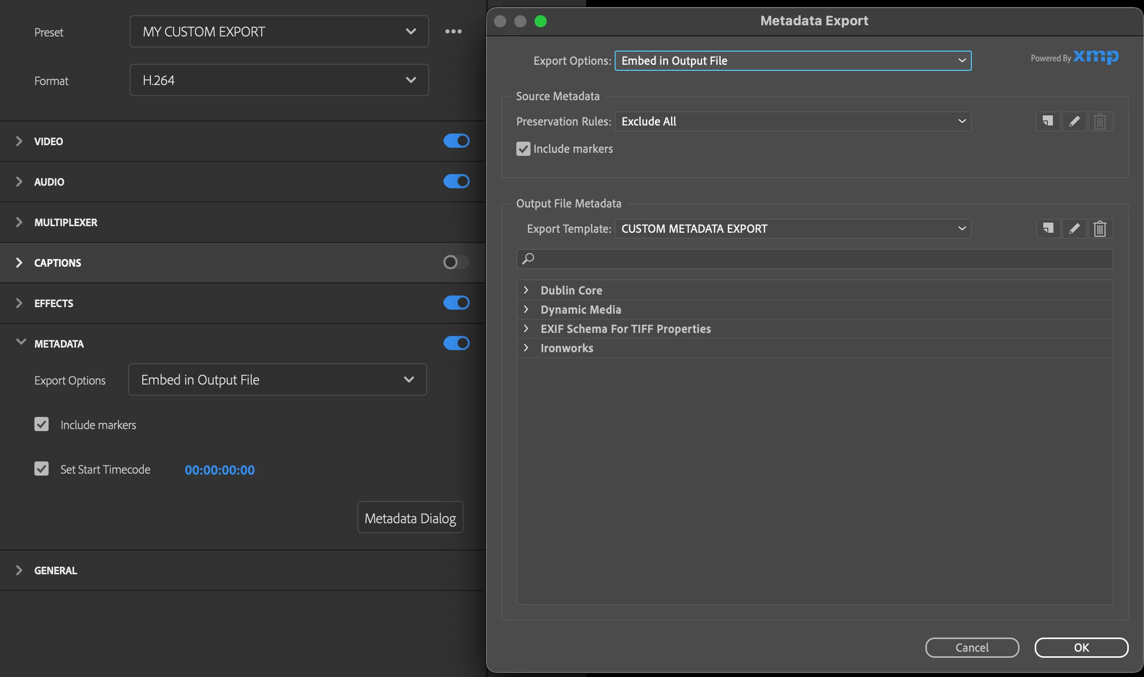 Save Metadata Dialog section within an Export Preset