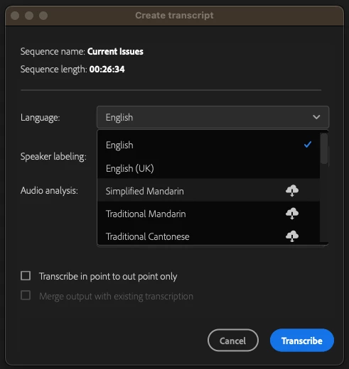 Its so very limited language that adobe premiere offer to use auto transcribe, there are lots of application that offer almost complete language for auto transcribe..