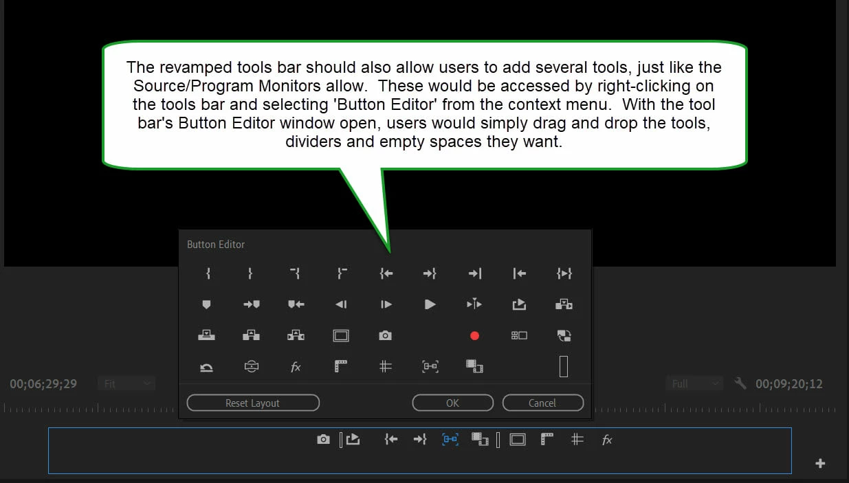 Pr's Tools window is of little help to anyone who uses much faster keyboard shortcuts to access their tools. Why not supercharge the lowly tools bar so that it can contain all of a user's favorite items?! (audio/video clips, titles, transitions, effect presets, etc.)