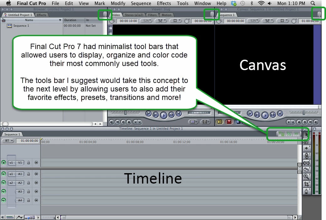For all of the details, please see illustrations. Final Cut Pro 7 had something similar to what I suggest but it was far more limited.