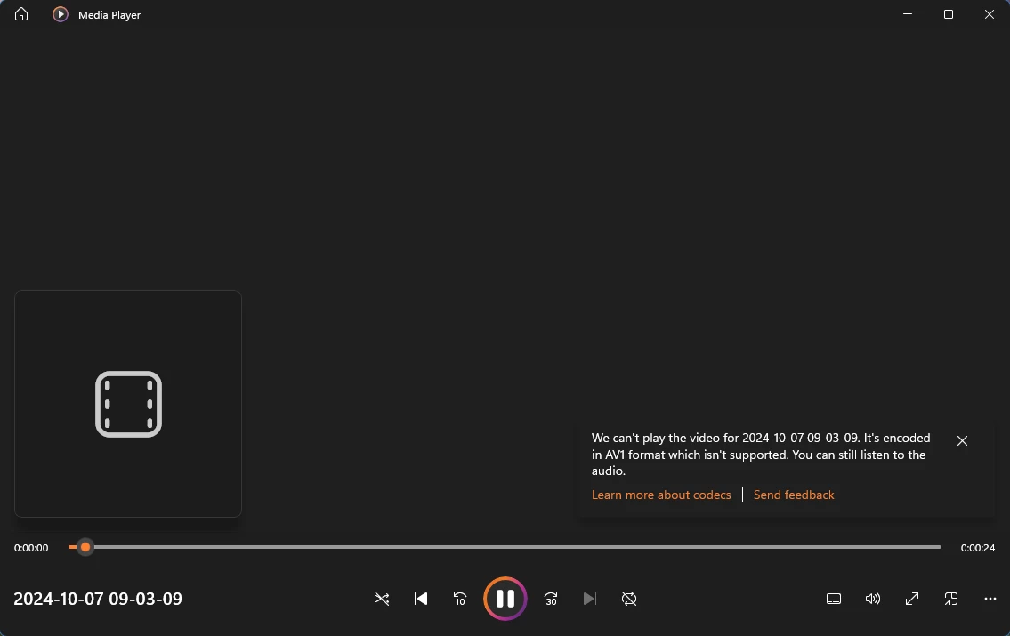 The clip runs perfectly smooth with Windows 10 video player (no need for vlc or alike). NVIDIA supprts AV1 in hardware since the RTX 30 series: https://www.nvidia.com/en-us/geforce/news/gfecnt/202009/rtx-30-series-av1-decoding/ which is 4 years (!!) back now (GeForce RTX 3090 official launch: 24. Sep. 2020).