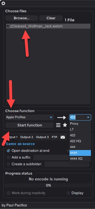 1) Drop the webm in, 2) select ProRes 3) Click Start Function.