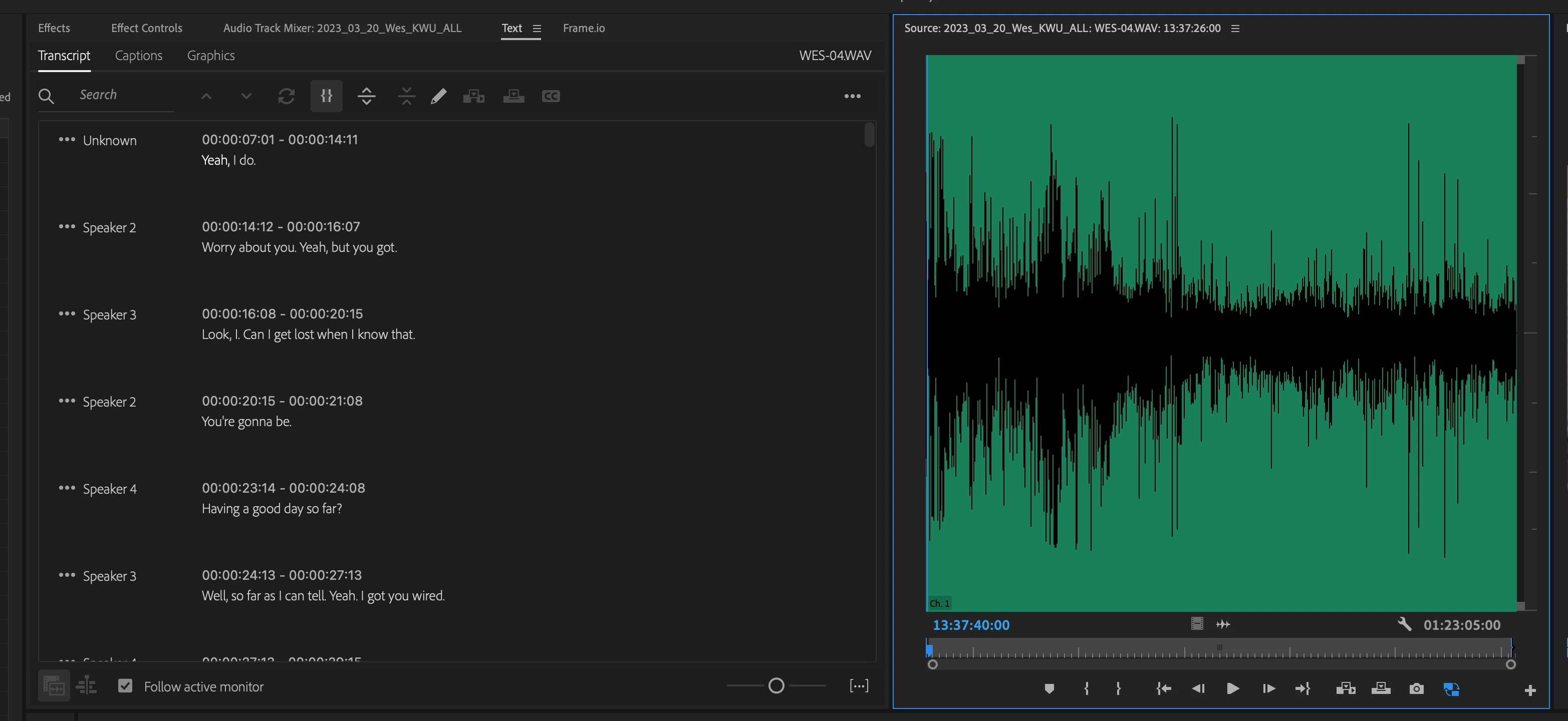 As you can see from thsi example, the head of my audio file starts at time code 13:37:40:00, but the transcibe of the source starts at a null of 00:00. If I'm overlooking something obvious regarding this, let me know please.