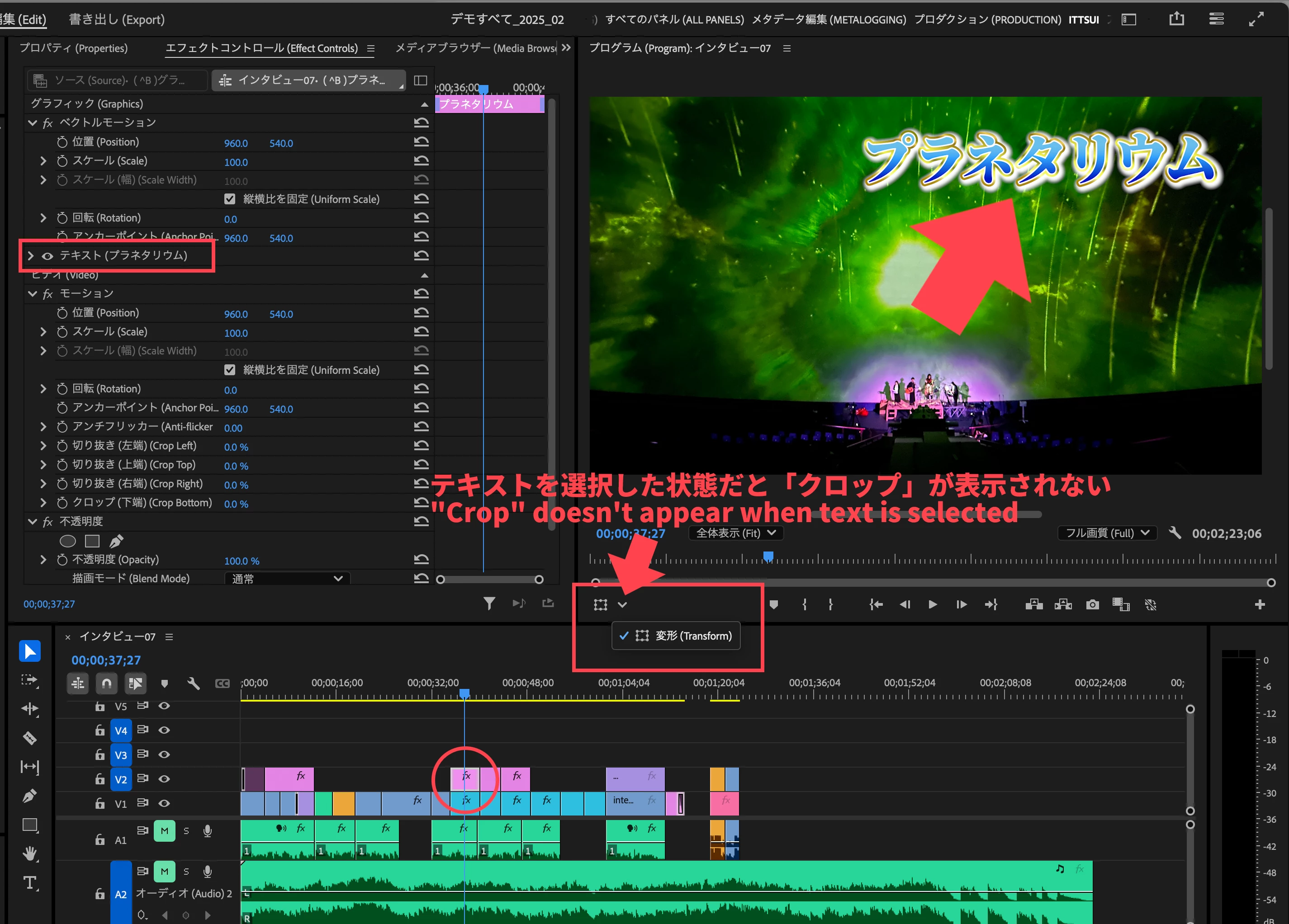 テキストを選択した状態だと「クロップを直接操作するための切り替え」に「クロップ」が表示されない。