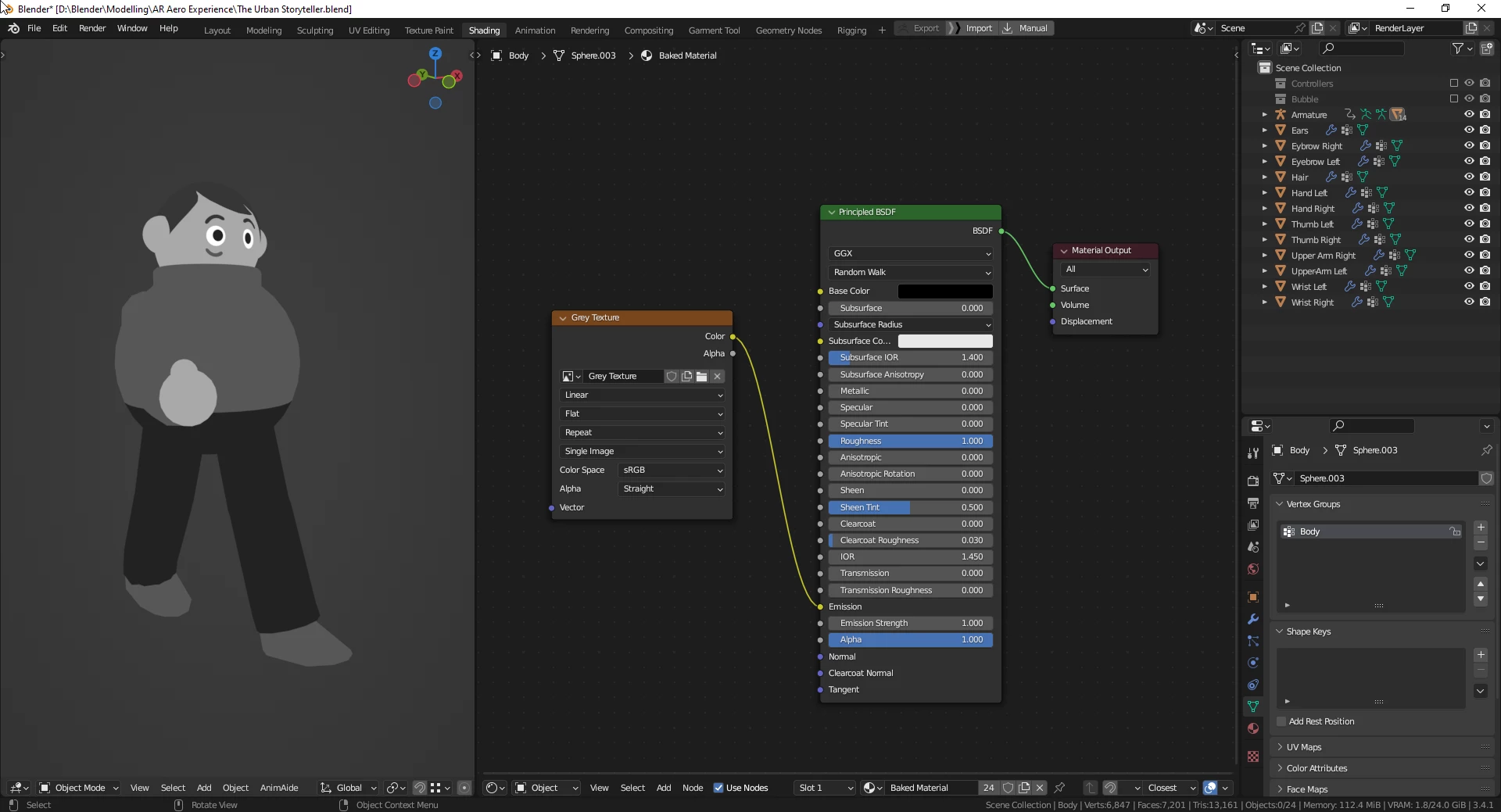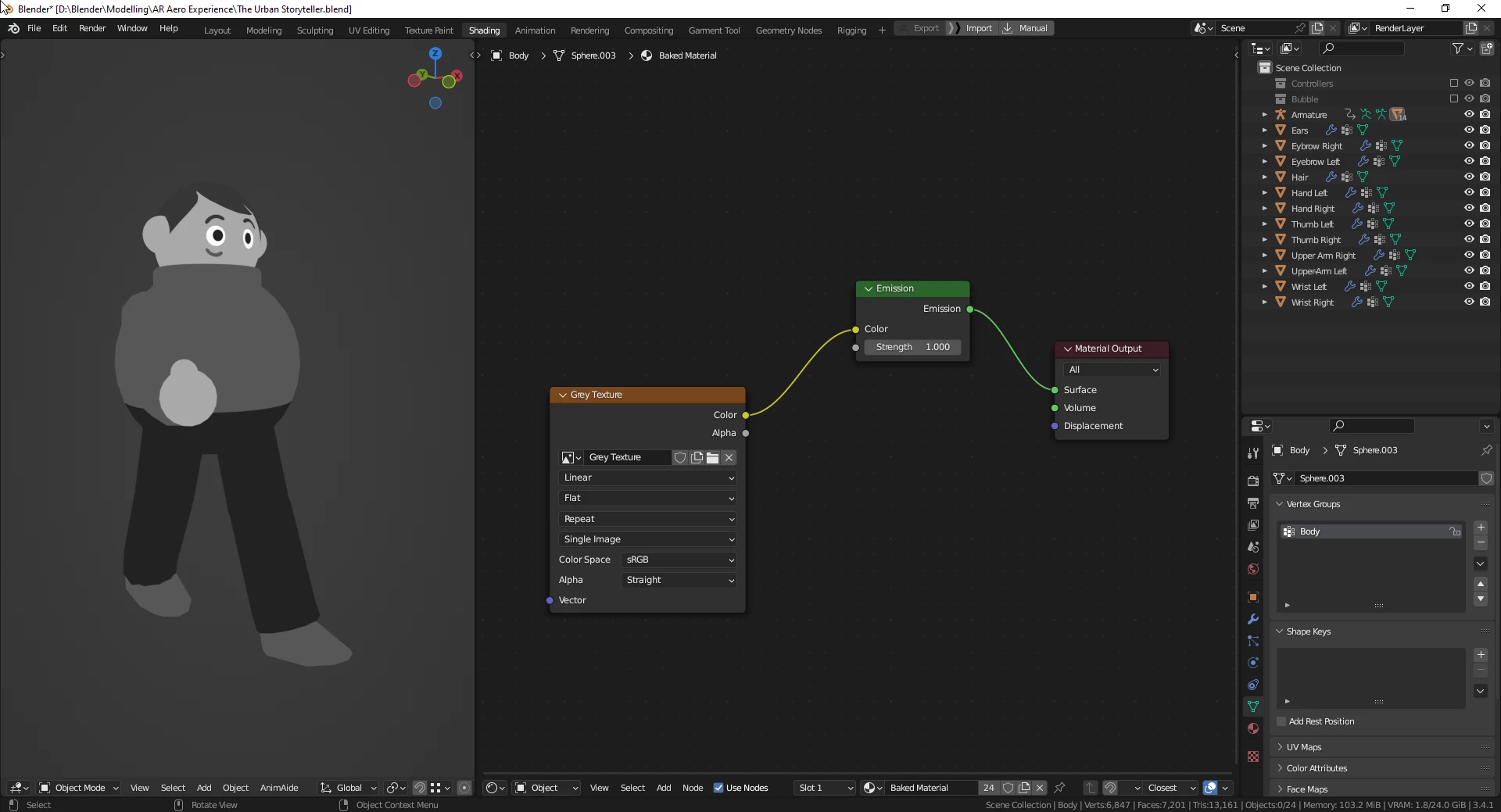 I exported the model and tested it out in a .glb viewer browser online, and all seem to look and move exactly as I wanted it to look! Sadly, when importing the .glb model into Aero, it seems there's still some PBR influence suggesting forms to my geometry. Theres no options to change or influence the shader to match the style I'm looking for.