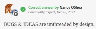 Don't cut down the functionality in the Ideas section! it's very inconvenient when I want to reply to smb's comment & have to quote it manually. Esp. when the topic is full of comments. If I just tag the person, other readers will easily lose the point of the discussion because that comment was somewhere too far on the page. If I quote it manually, it doubles the amount of the text for the viewers. NOT user friendly at all!!!