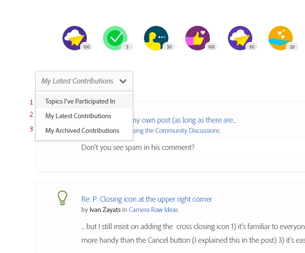 You should add "Topics started" & "Ideas posted" to this menu. Will you?