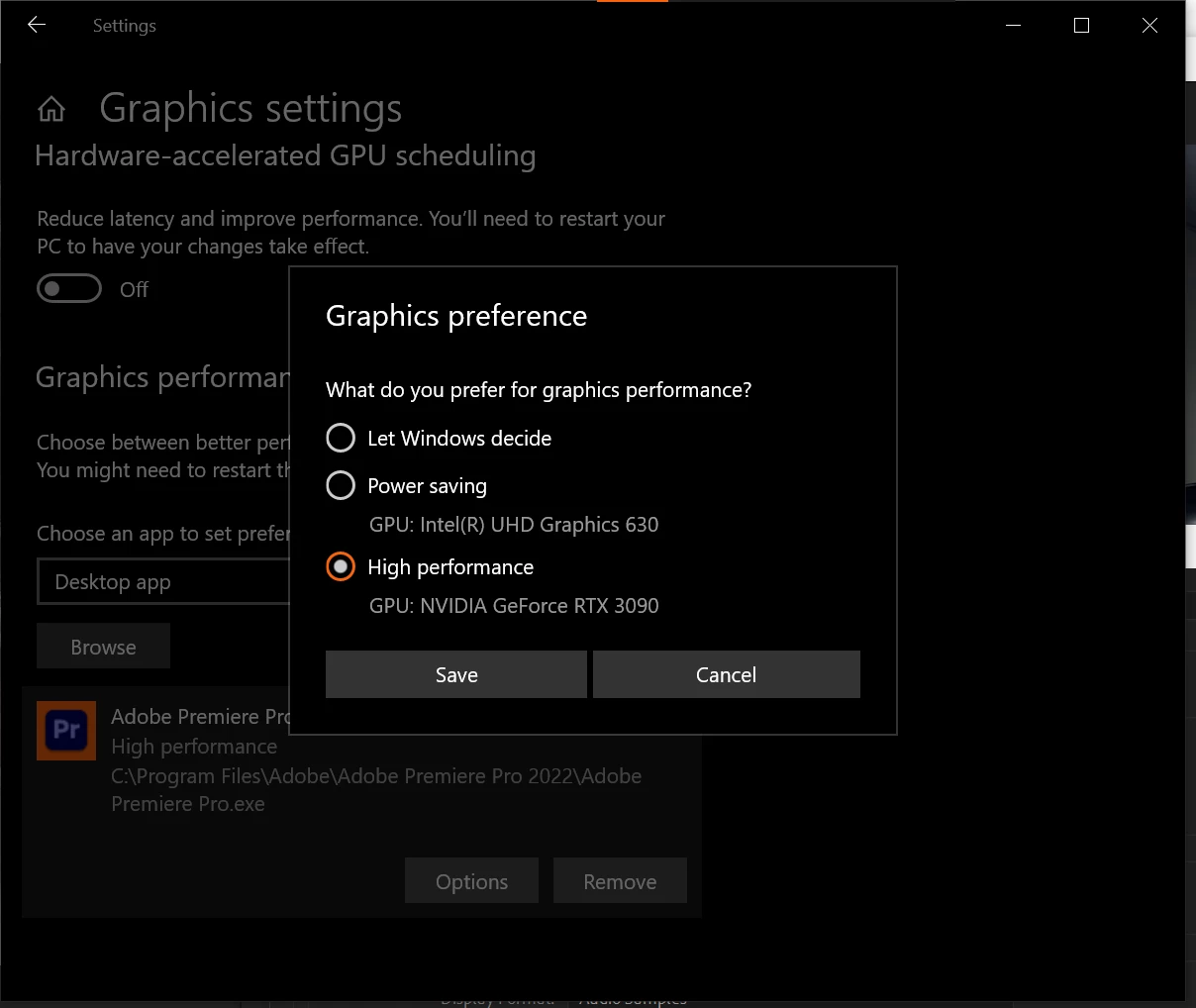 Hello. I'm having trouble playing back video in my timeline after i speed it up. Sometimes anything over 300% speed will lag. I have a pretty hefty system so I'm not sure why it would lag so bad. GPU acceleration CUDA is enabled. Windows graphics settings are set to GPU high performance. I usually use Iphone .MOV HEVC 4k footage. I can play anything back in normal speed 4k full res in timeline without rendering but when i speed it up it lags. I have Premiere Pro installed on an M.2 SSD but i keep the footage on either an internal HD or portable HD. When the final video is exported it is fine but id like to preview smoothly before export. I have 2 32" 4k monitors 1 hooked up to internal graphics and 1 hooked up to GPU. I use the one hooked up to GPU for premiere pro. Maybe if i plugged both into GPU and turn off internal graphics? Please help.