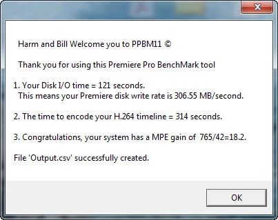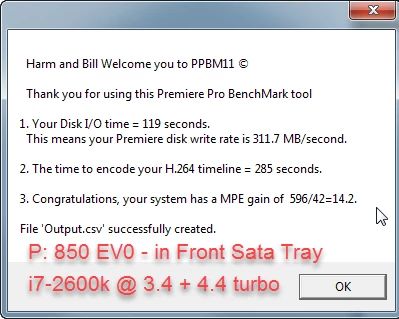 For the most part, those results are typical for a system with a non-overclocked (or default Turbo'd) i7-2600K with a mid-range Fermi-generation GPU. However, the 306 MB/second result in the Disk I/O test is below average for a SATA SSD. This is because you have a budget SSD (an OCZ Trion 100) as your secondary (media/projects) SSD - the Samsung 850 EVO, even at the 250GB capacity point, is capable of well over 400 MB/second in the PPBM Disk I/O test (based on my own testing). What's more, the i7-2600K in the CPU-intensive MPEG-2 "MPE Off" test is only slightly faster than my i5-6500 result in that same test.