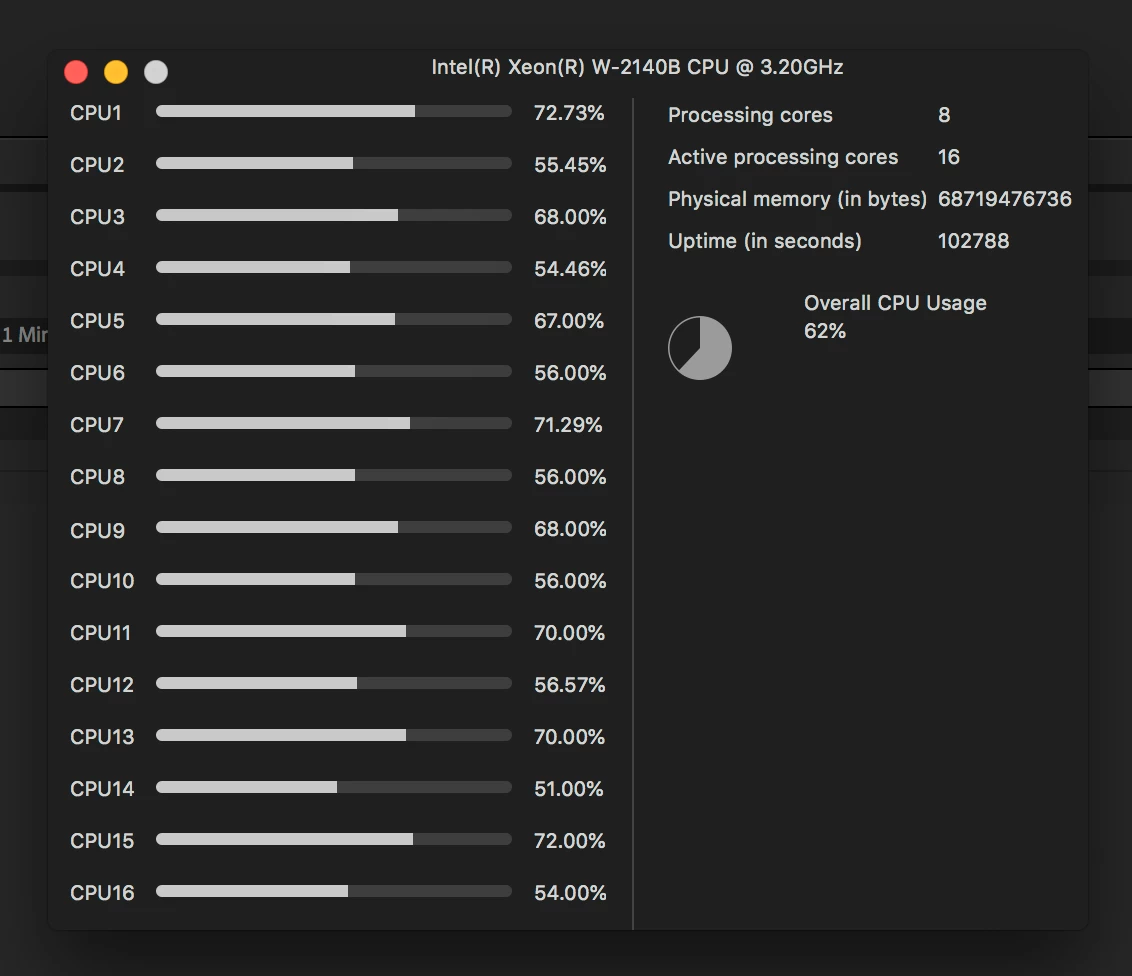 Also just bought the 2017 iMac Pro, 3ghz 10core processor, 64 gb ram, 16 gb GPU and wow After Effects is not benefitting from the power of this machine.