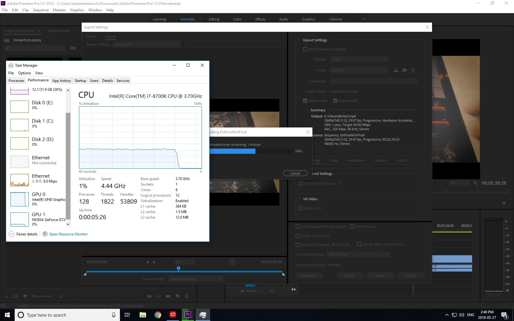 The problem I'm running in to now, is that every single time I try to render out using Hardware Acceleration (these are work computers, have successfully used HA many times at home since the update on my 7700K, which exports the same file size in 3 mins vs 7 on the 1800x) the export "freezes" at either 1 minute 4 Seconds remaining, or 1 minute remaining. I say freezes in quotes because the system is completely responsive, the software is still mostly responsive as well. It just gives up. Usage across the board drops to zero, and never continues. I then have to close premiere before I can even resume playback on the timeline, however any other features are completely accessible. This is my third OS re-load as well.