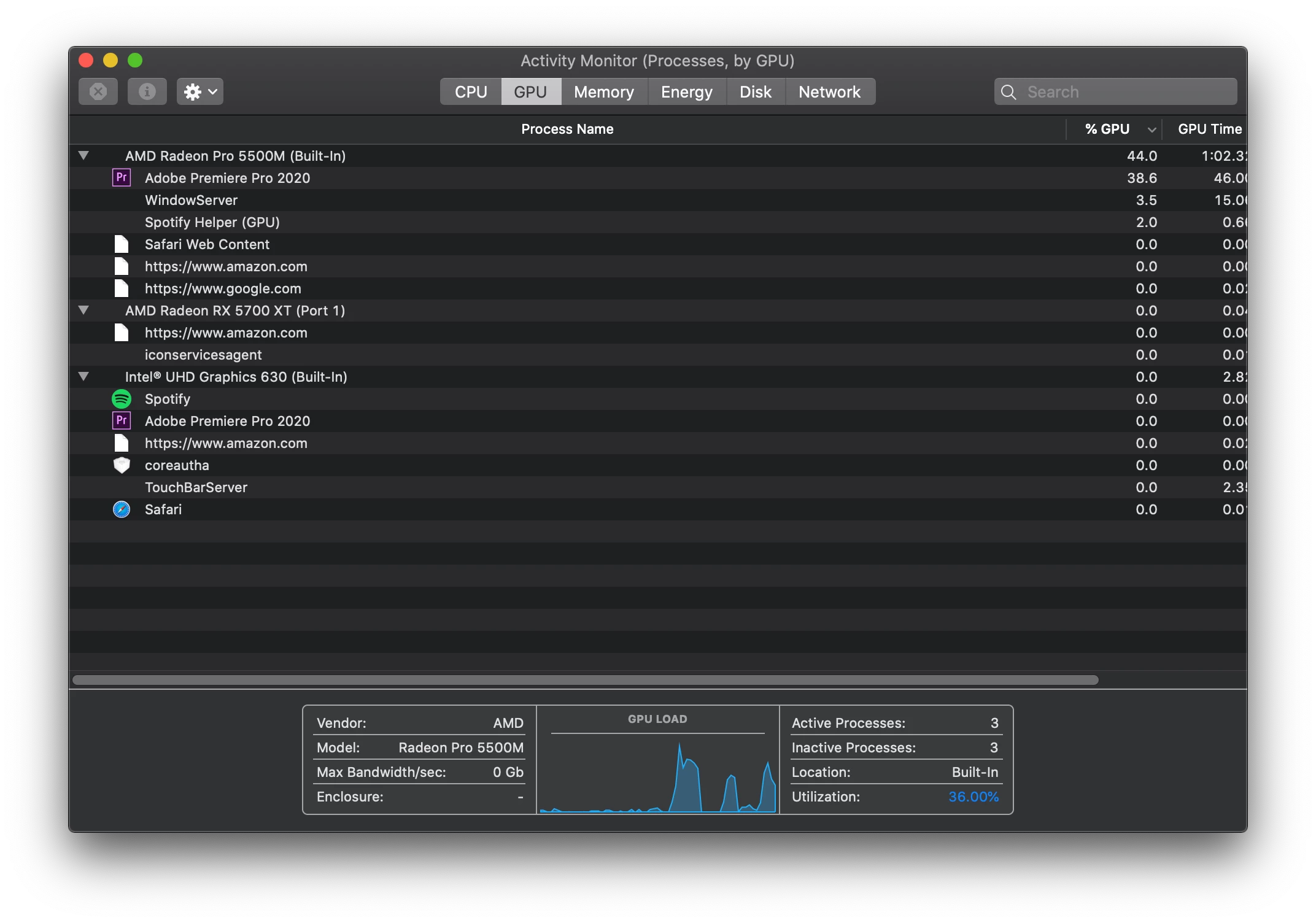 I've set Premiere and After Effects to "Prefer External GPU", but it seems as though it is still relying solely on my internal GPU while I am working. The only time I see an uptick is when I render, but it still seems to be bottlenecking on something -- my system CPU, GPU, Memory and Disk are only getting used at 50% max and I'm having 10min+ render times.