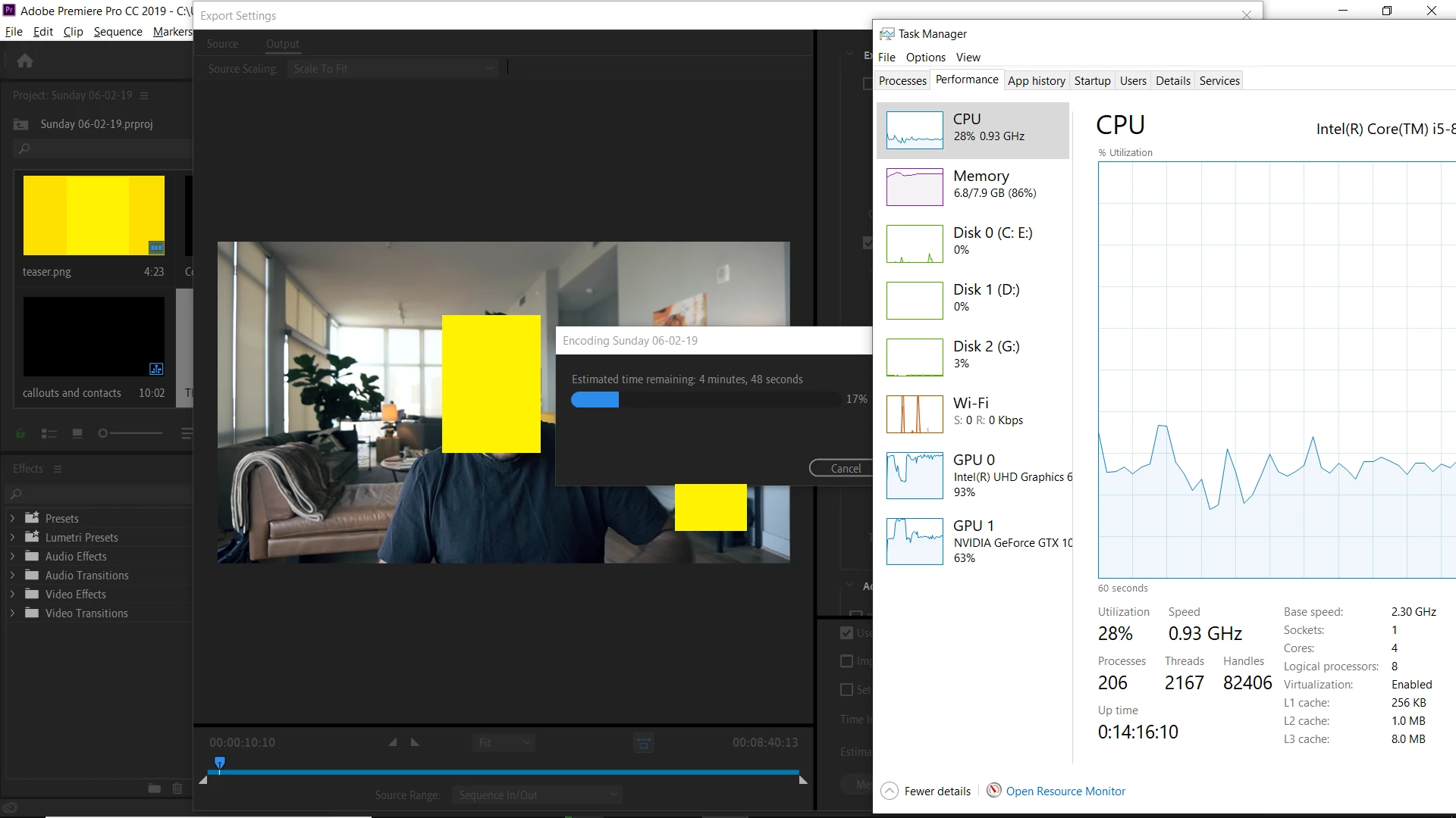 Screenshots (Premiere running, Rendering previews for a project of mine):