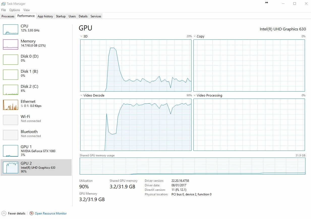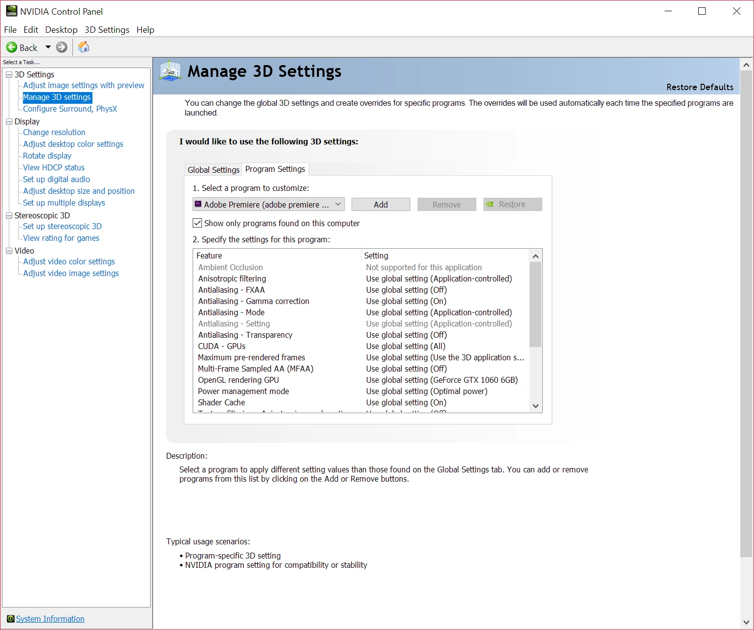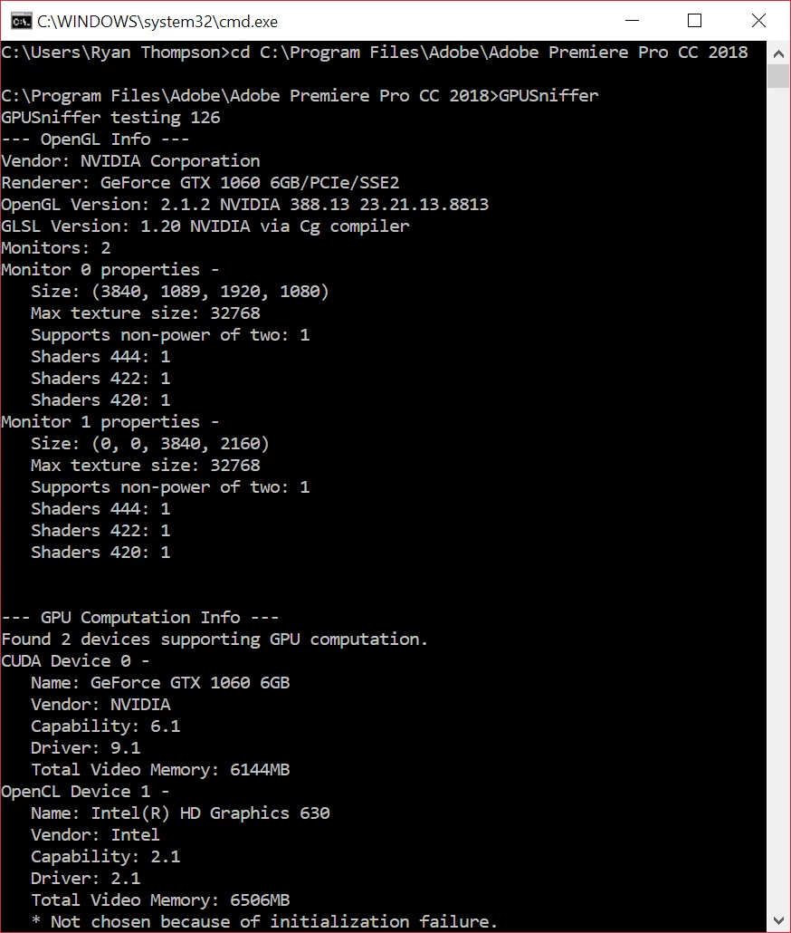 Hello all, I have a quick, but important question about Premiere Pro CC 2018. It seems that Premiere Pro is using my integrated graphics on my CPU rather than using my installed and working dedicated graphics card to render GPU accelerated effects and such. I am running a fresh install of Windows 10 with the latest updates. I also have a fully updated Creative Suite. Below I have listed my system specs and screenshots for reference to the issue. Notice that under GPU Engine in Task Manager, it lists GPU 0, my integrated graphics. I have also done some research of my own, and I have come across adding the "cuda_supported_cards.txt" into Premiere Pro's installation directory. I have done that, and I have tried both typing "GeForce GTX 1060" and "GeForce GTX 1060 6GB" into the document, but its the same story for both cases: it uses my integrated graphics. The file currently lists "GeForce GTX 1060".