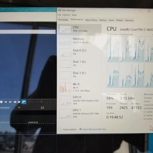 Now running Photoshop or a Video editing program everything seems to be working well without crashing. See the shot below taken while a multi clip video was running in one of my video editing programs.