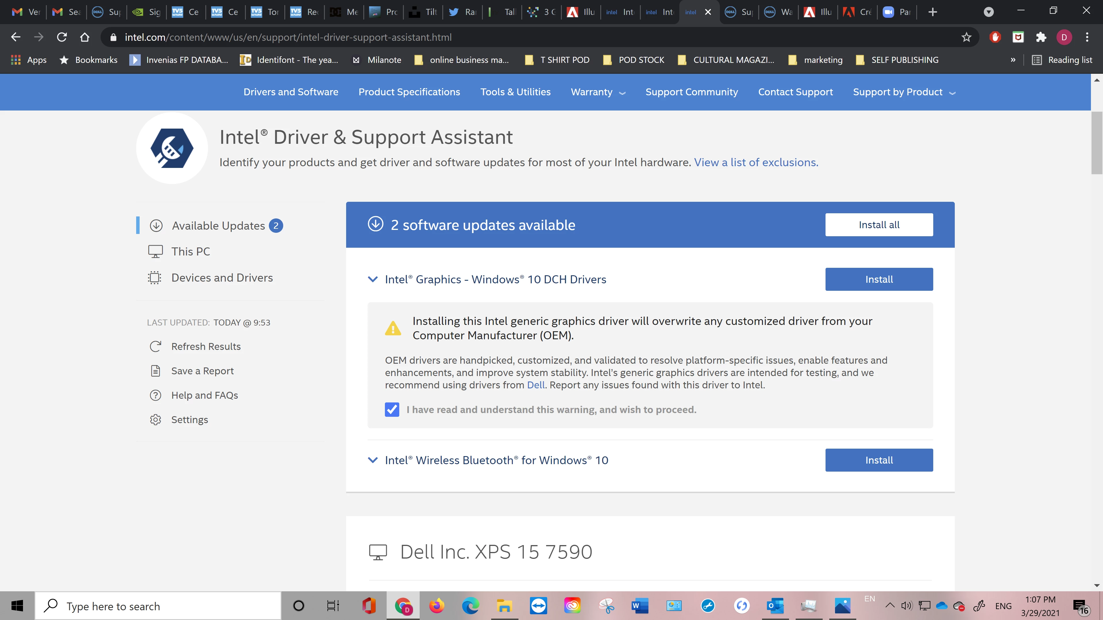 So I went to the Dell website to download their latest driver version available but no, Adobe still doesn't work for me. This is the Dell webpage where I downloaded the latest version and now it says that I'm all up-to-date: (but Intel says I have 2 updates waiting)...