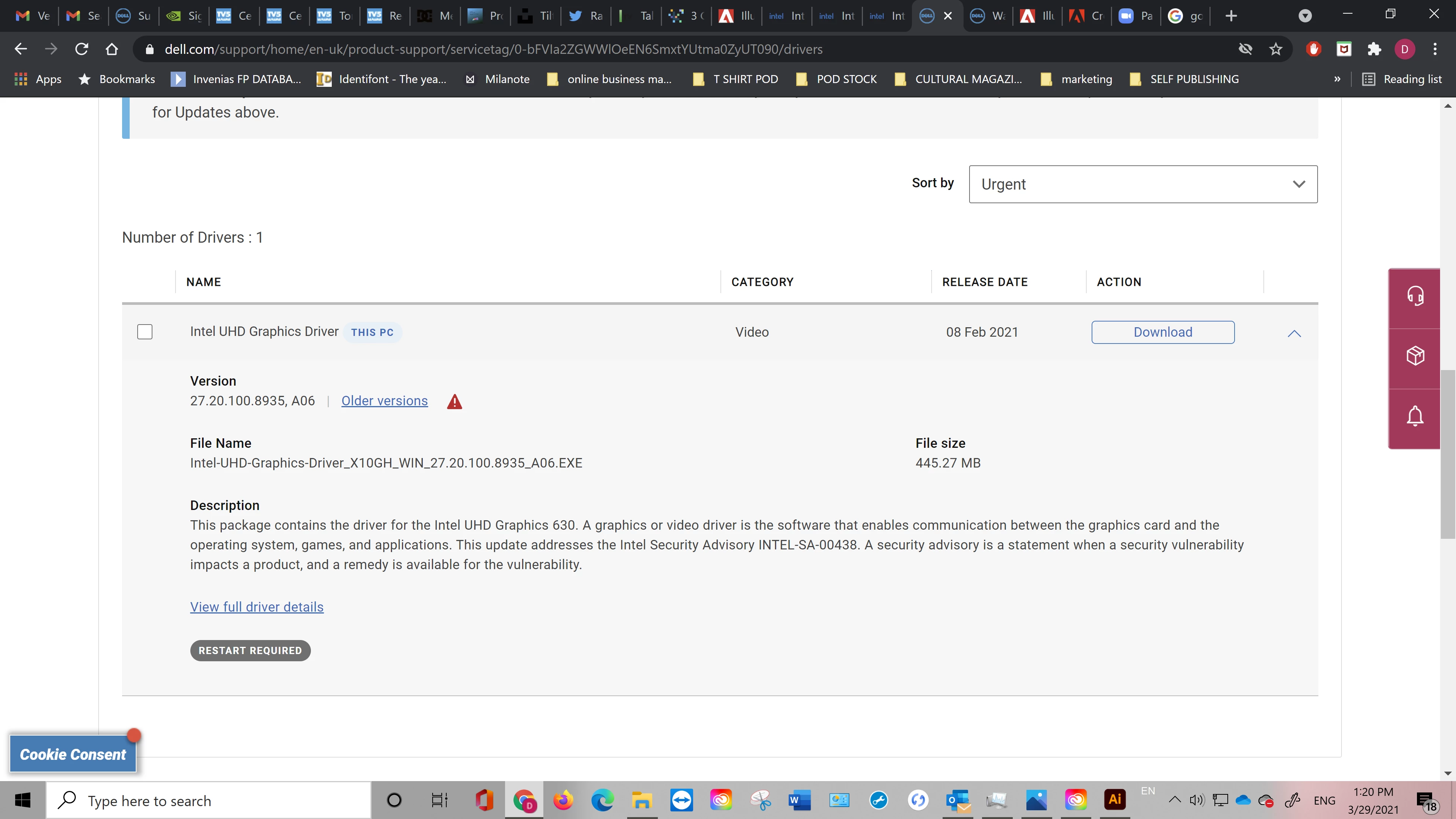 The version of the driver that Adobe wants me to download is a newer version than the newest version available from Dell at this time; see the screenshot of AI where it asks specifically for version 100.9168 or newer in the above screenshot? Well, the latest version availabel on Dell (and is the accredited safe version approved by Dell, whereas Intel versions are NOT recommended apparenlty, by Intel themselves as stated before) is 100.8935! WHAT A JOKE. (see screen shot below).