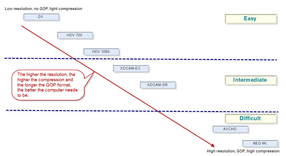 Some codecs are easy to handle for a computer, others are difficult to handle. It is generally known that DV material is very easy to handle and AVCHD is pretty tough to handle. The general rule is that the more compressed the material is, the harder it is for the computer to edit this. GOP (Group of Pictures) structure is an extra burden. The higher the resolution, the harder it is on the computer.