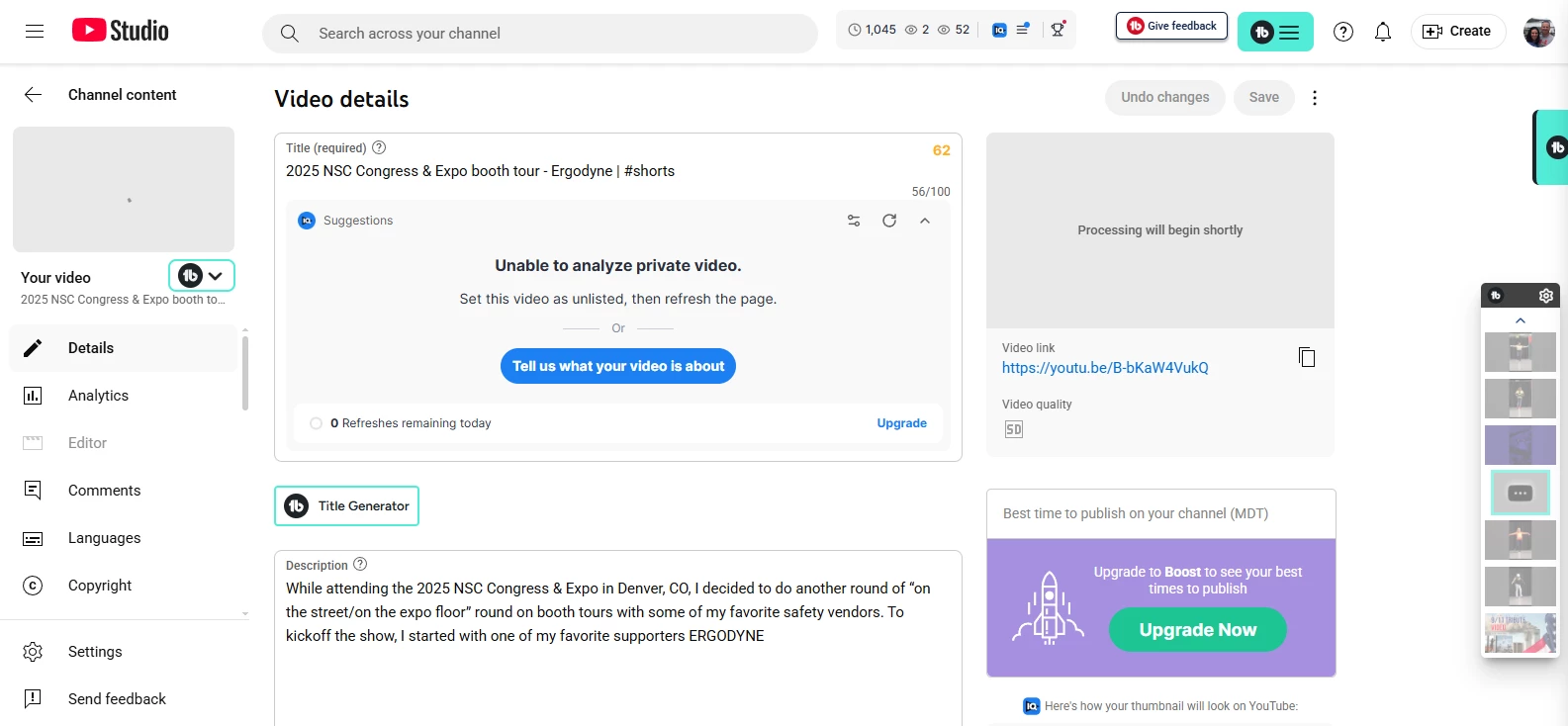 Now, since the original video is in "Video is processing" jail, I will have to re-upload the video to my YouTube channel and delete the one that is still processing.