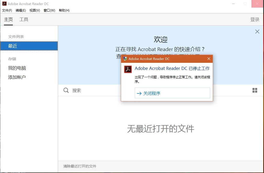 打开adobe acrobat reader dc后提示停止工作