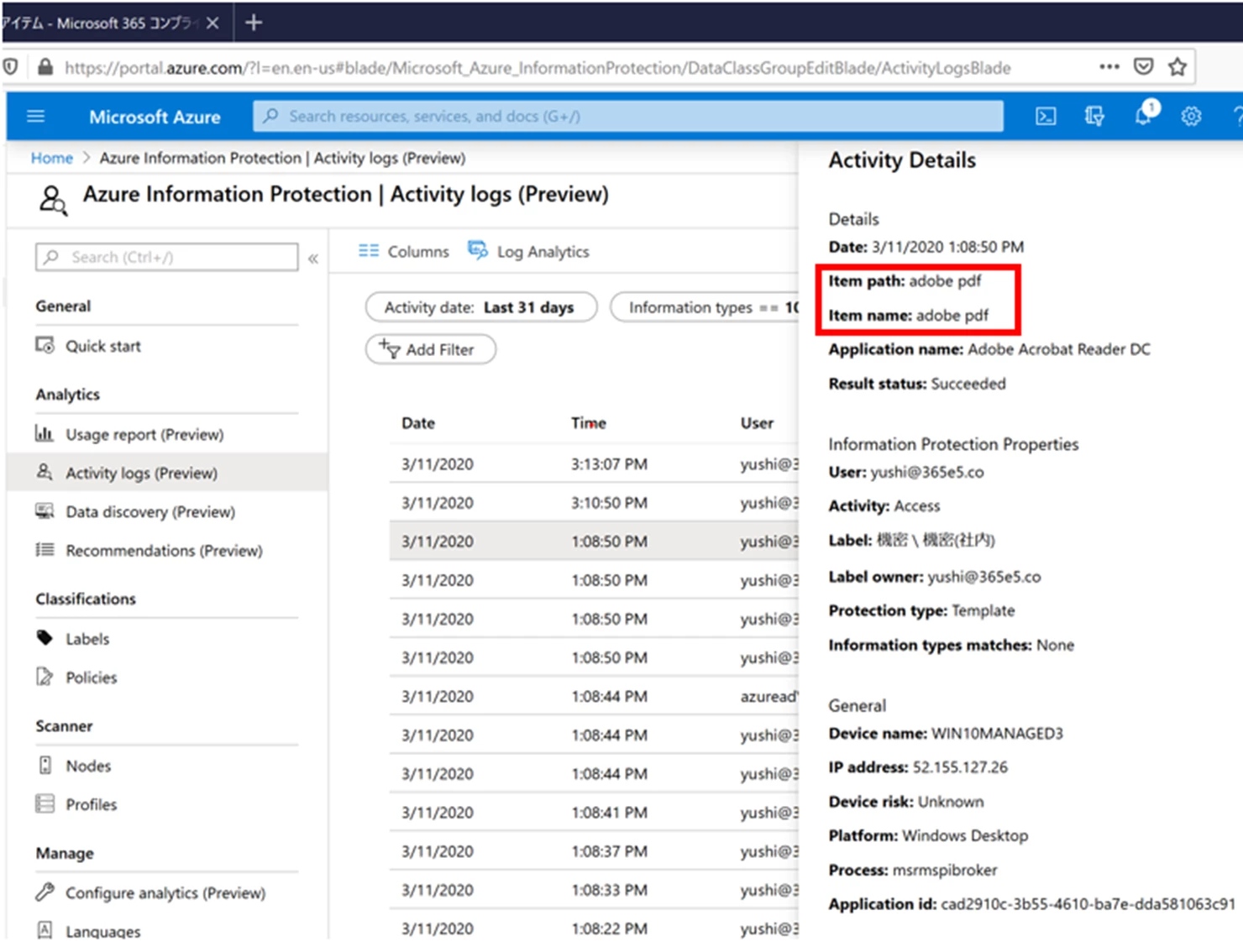 Issue 2. When I access protected PDF files, "Item path" and "Item name" are not correctly recorded at the AIP central reporting sites which are managed by Microsoft. Just "adobe pdf" is recorded in both fields. And two entries were recorded per a access. This seems MIP plug-in is not using correctly MIP SDK for decrypting AIP protected PDF documents and not reporting correctly required document information to Microsoft.