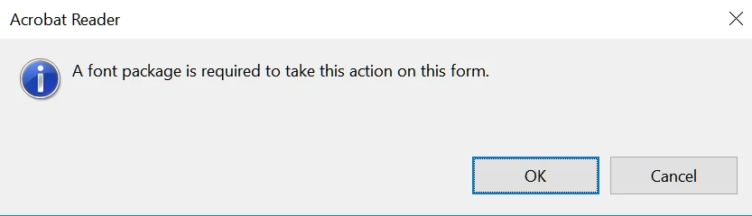 However, whenever I type Chinese character there, it pops up below dialog. I have reinstall the font package, restart the acrobat reader, but i still cannot type any Chinese character. Please help.