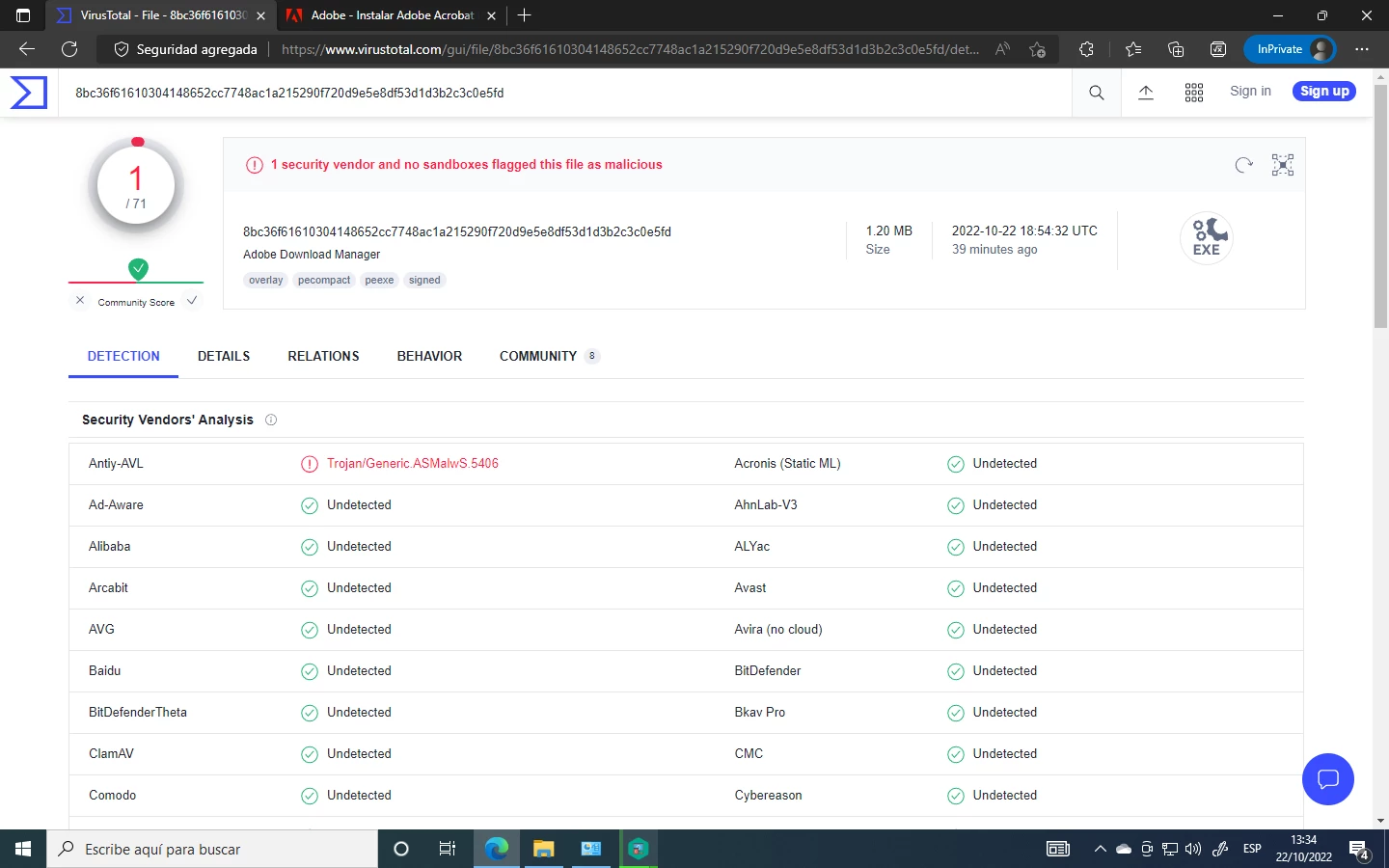 Buenas tardes, hoy descargue Acrobat Reader desde la pagina oficial de adobe pero al analizar el archivo ejecutable mediante Virus Total me indica que el archivo esta infectado de un troyano.