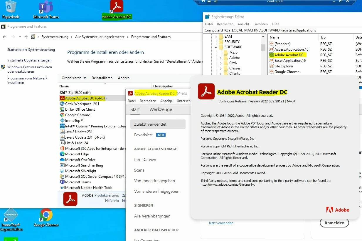 We're using Adobe Acrobat Reader DC as our primary PDF application and manage the default file type associations using GroupPolicy (as outlined here: https://www.adobe.com/devnet-docs/acrobatetk/tools/AdminGuide/pdfviewer.html). This used to work very well in the past, but lately we've noticed that some of our users were loosing this setting and .pdf started to be opening in MS Edge again. After some troubleshooting, I've noticed that the version changed from Adobe Acrobat Reader DC to Adobe Acrobat DC, which means that the ProgID changed and thus, the default file type associations through Group Policy would no longer work (Reader uses the ProgID "AcroExch.Document.DC" while Acrobat is using "Acrobat.Document.DC"). While the application itself shows "Adobe Acrobat Reader DC" in the "about Adobe Acrobat" window, it'll turn up as "Adobe Acrobat DC" in the registry and in the control panel. Everytime this happend, the application was updated prior so I think the updates are causing this.