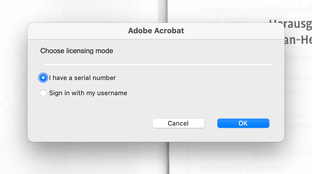 Same problem:  virtually every time I open my newly purchased and paid for and licensed and installed Acrobat Pro 2020, it gives me this message (screenshot).  So far, if I just hit RETURN it takes me on to the app properly, but it's annoying and I know that it can go bad and stop recognizing my right to use the software.  I only bought this product because the Creative Cloud instance that my employer licenses was *never* reliable and kept forgetting that I was licensed even when CC showed Acrobat as installed.  Is Acrobat just badly written software?  Is there any way to use it as you would normal software?