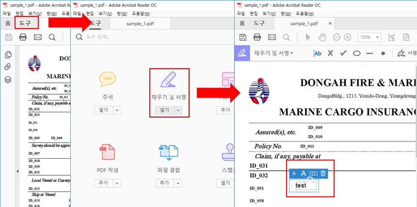 - error step : tool (도구) --> fill and sing (채우기 및 서명) --> insert text --> press ESC key for End input