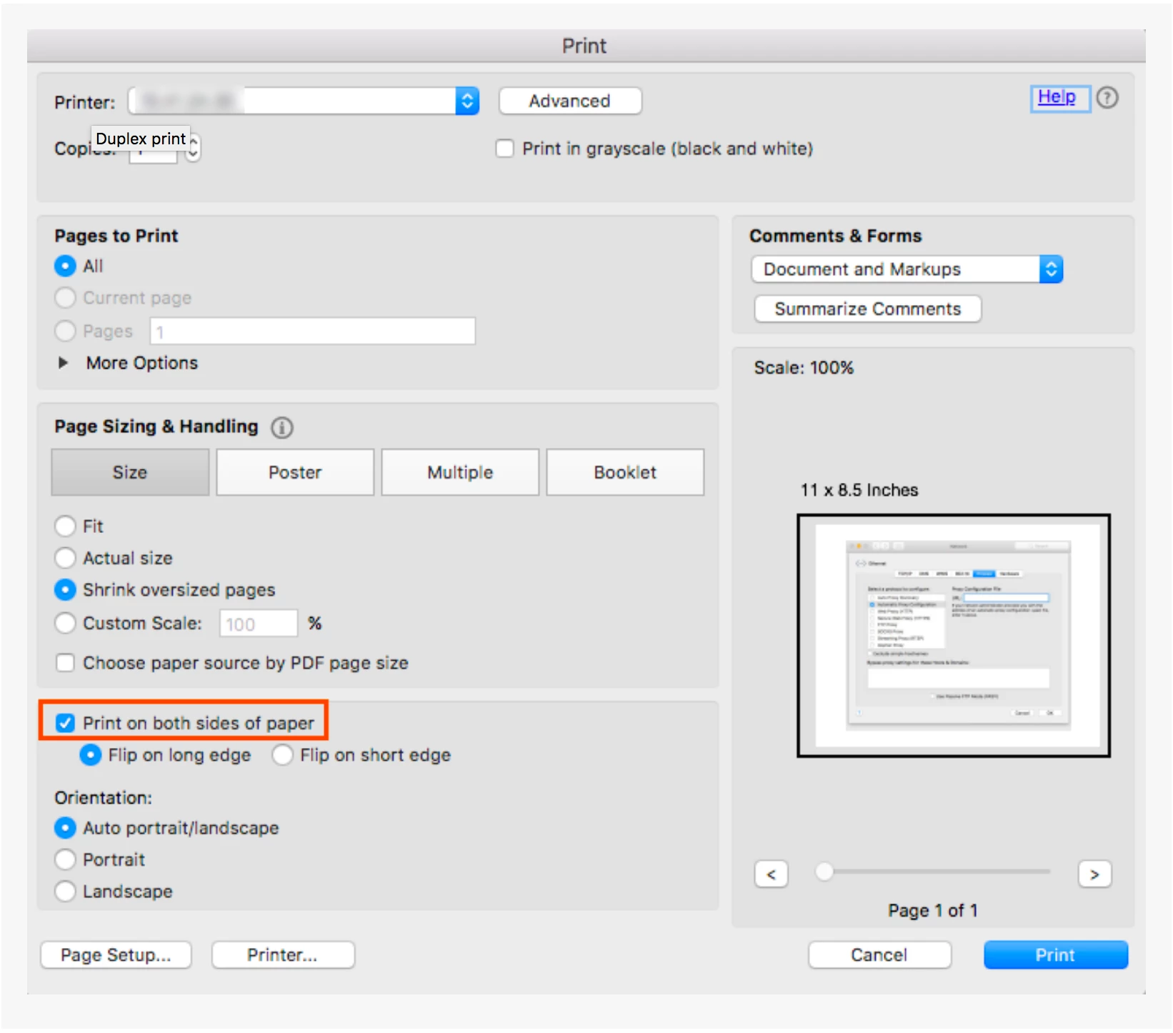 I downloaded and installed Adobe Acrobat Reader DC on my iMac running macOS Sierra 10.12.6. I own a Brother HL-L6200DW duplex (2-sided) printer. According to Adobe when I click on the print button I should see an option to Print on both sides of the paper.