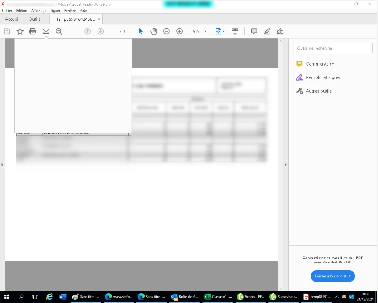 Hello, I'm using ADOBE Acrobat Reader DC (32Bits) version 2021.007.20099 on RDS Farm and my users tell me that somestimes they cant print PDF from Adobe. They have a Blank page (CF Screenshot). The problem dissappears when they close their sessions and re-open it.