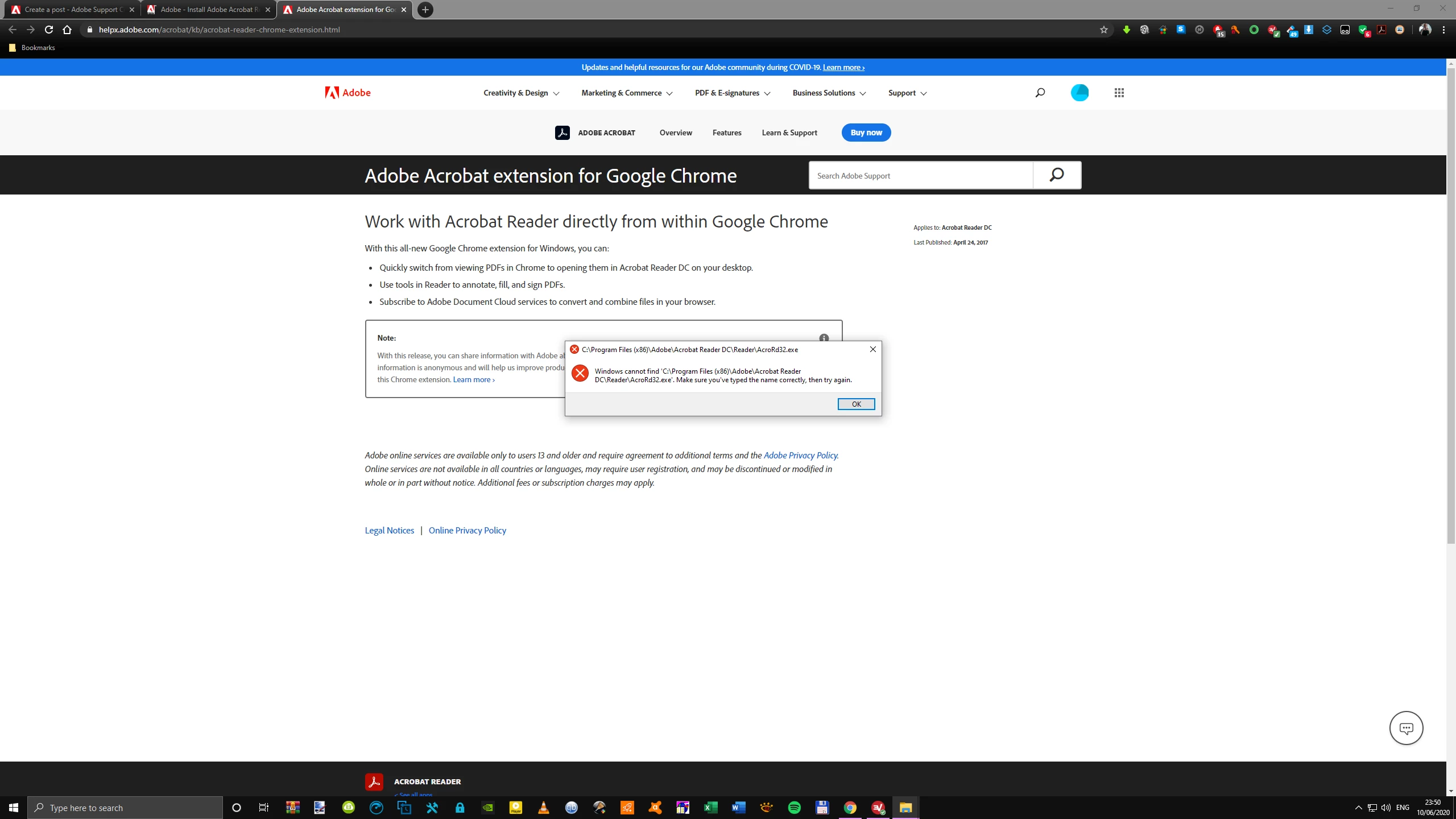 Acrobat Reader DC won't run under Win10 Pro version 2004